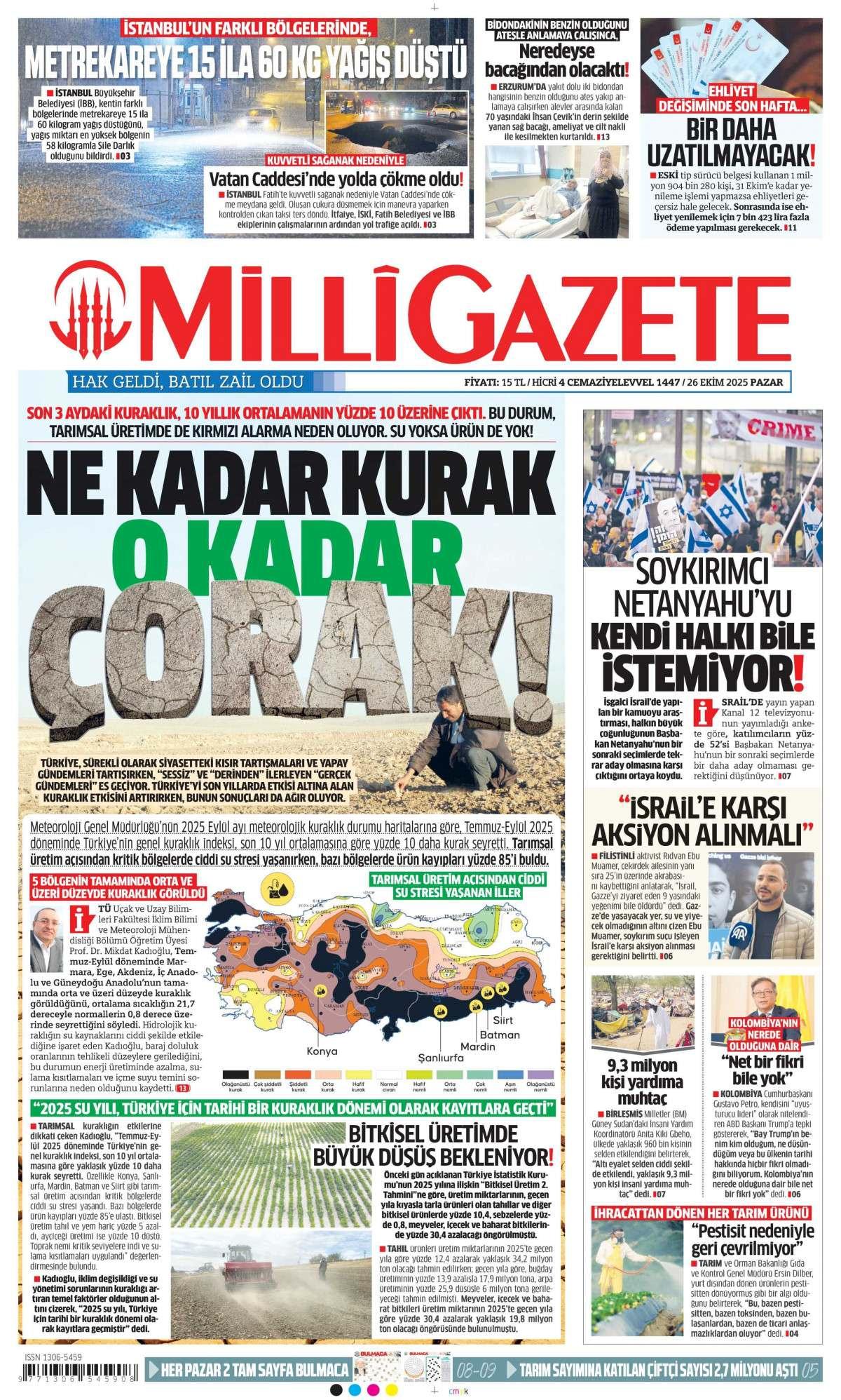 Milli Gazetesi 26 Ekim 2025, Pazar Günü Manşeti